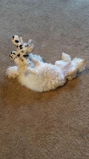 I think that his coat change may actually be exceptionally tricky. His best friend, the silver mini-poo is going through coat change and he is a bit tangly here and there but NOTHING CLOSE to what we are seeing with Puff. The owner of Puffy's sister has had numerous poodles and she said that she had never seen anything like it. She decided to shave her dog down during this time. The owner of his brother was also going to show him, but she gave up and shaved the coat. He has only one sister who also had a show contract, and her coat is really long, However, her owner said that this dog's coat already finished the change and it is now manageable. Interesting.